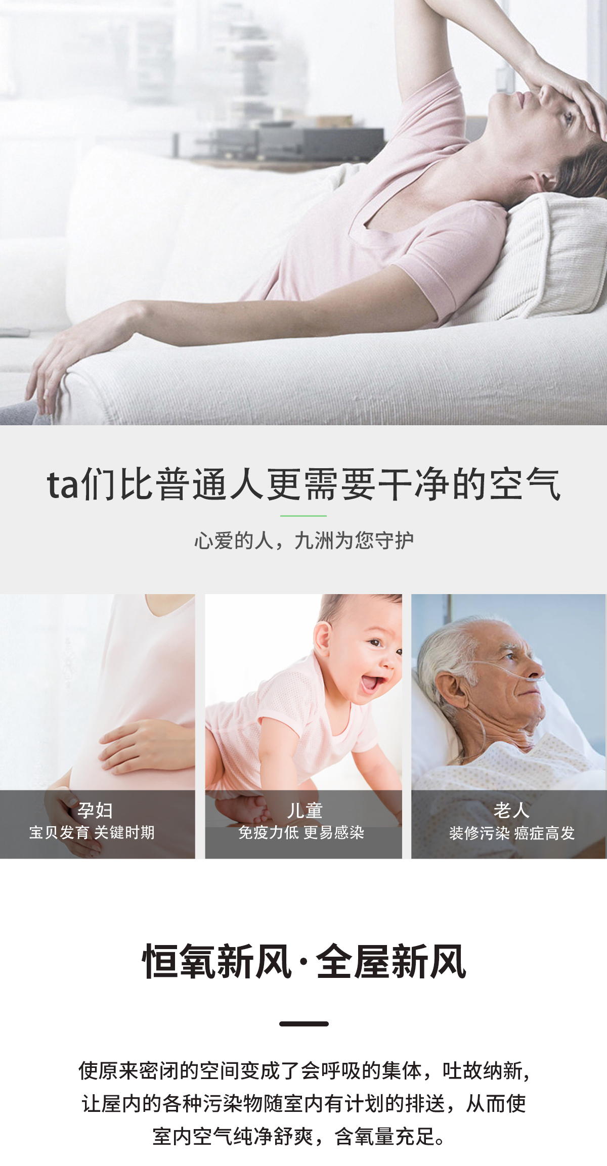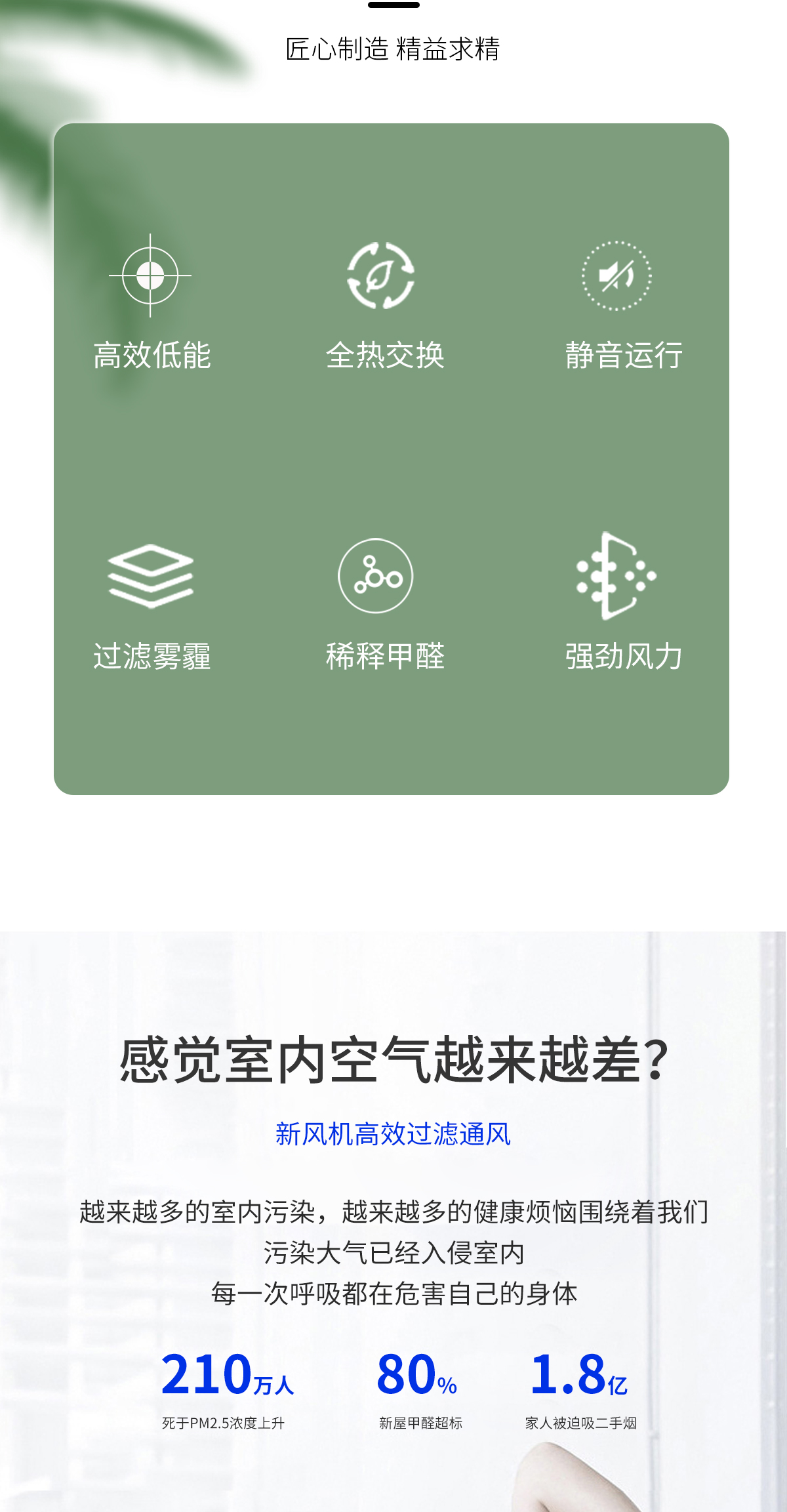 雙向換氣 室內外氣體等量置換。獨特的熱交換器設計,把室內污濁空氣與室外新鮮空完全分開,防止室內外空氣交叉污染 靜音設計,安全可靠 內置低噪音外轉子離心風機,機組璧覆有新型吸聲材料,運行平穩噪音低,防止了對現場的干擾。整機除風機外無運動部件,幾乎無需維護,可確保長期穩定可靠工作 過濾凈化功能 進入室內的空氣在機組中經專業級過濾器過濾,有效防止灰塵和有害物質進入室內,保持室內空氣新鮮,同時可選用靜電凈化器、負離子發生器、光觸媒等凈化設備
