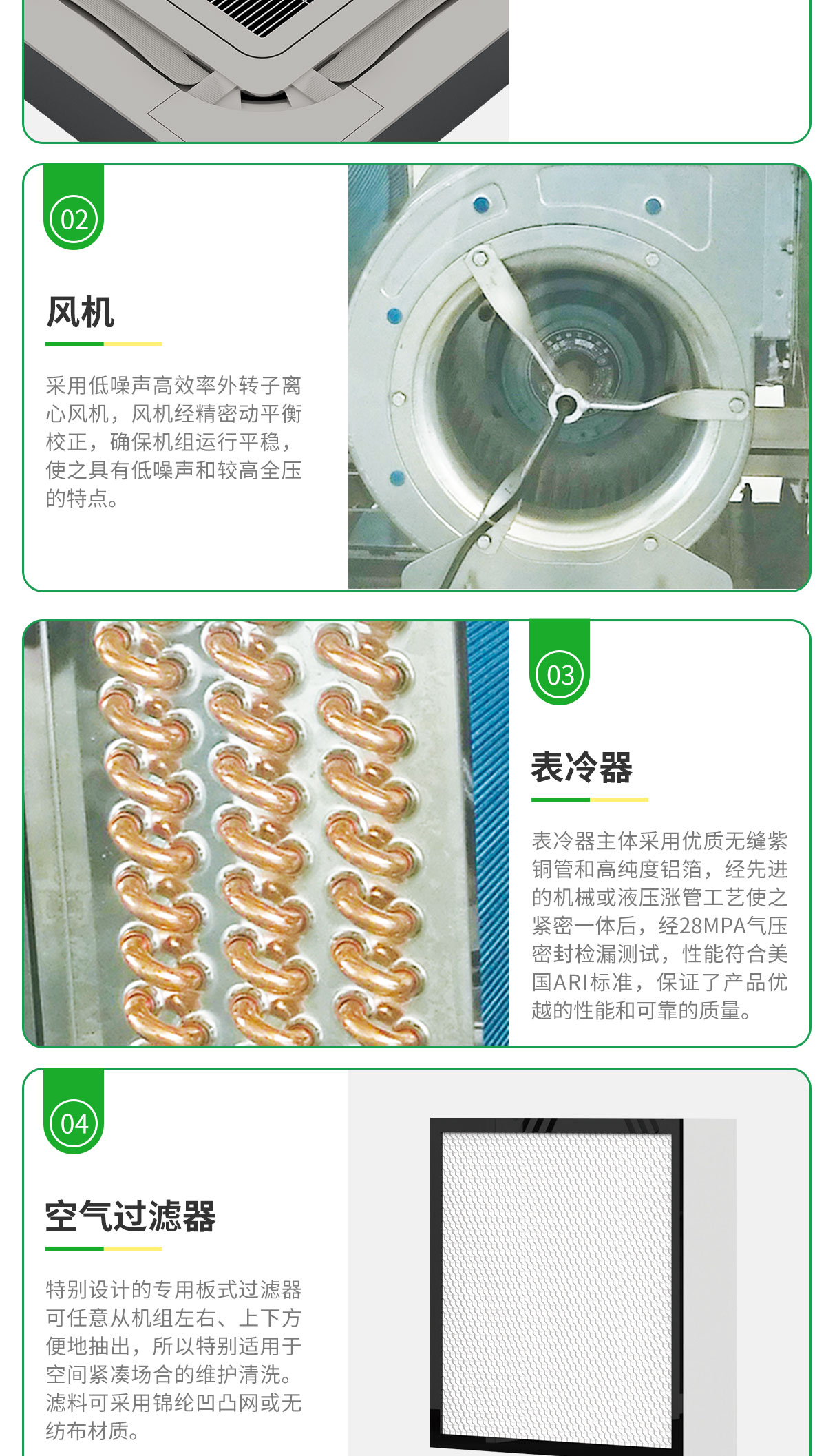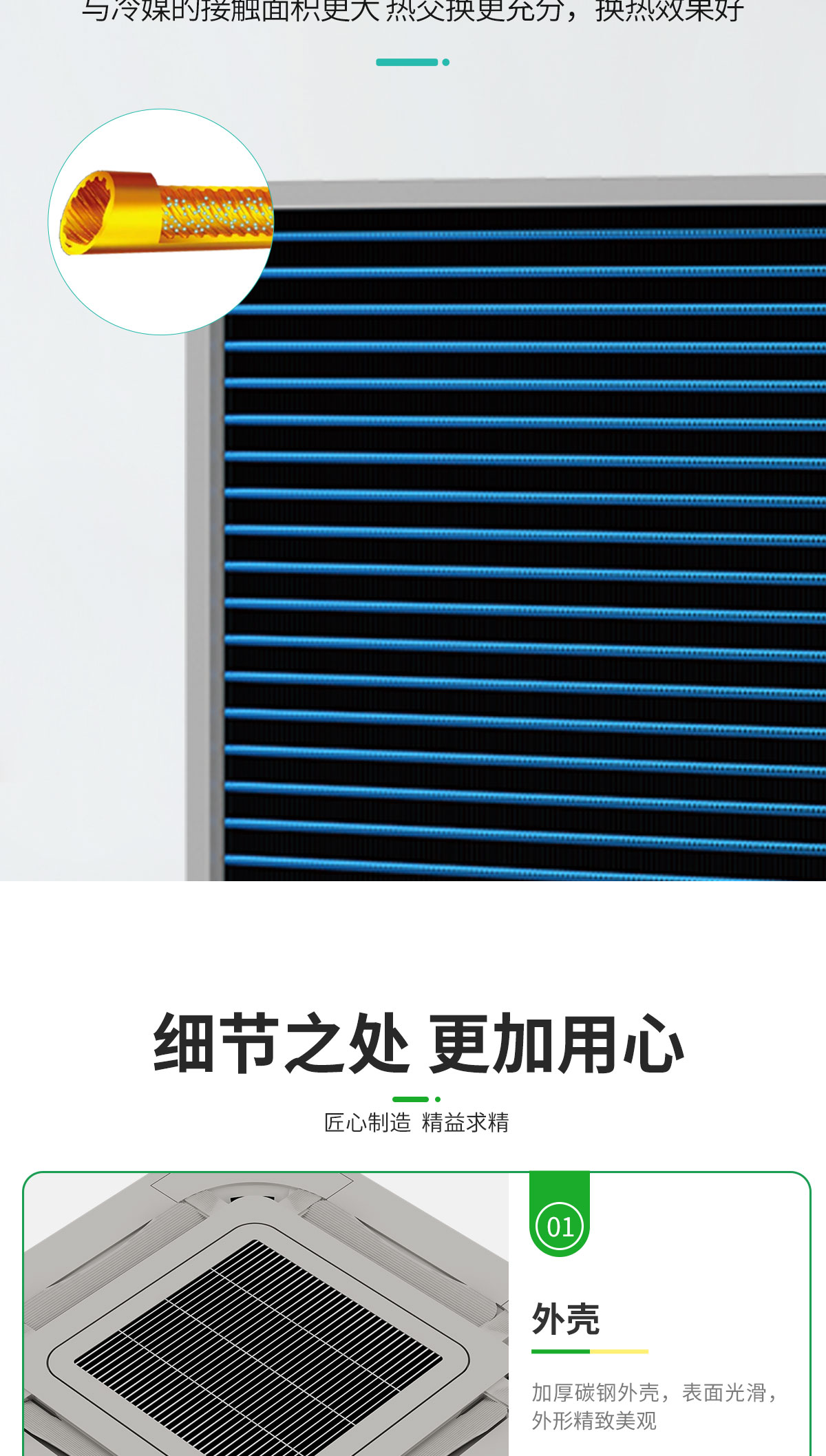 360°廣角送風,氣流均勻送達房間各個角落,出風柔和,舒適度更高 特有高、中、低3檔風速設計,針對不同安裝高度,可設定相應的送風檔,輕松滿足不同安裝高度的送風需求 卡式風機盤管預留新風引入接口,可用導管將室外新風引入、經由全新的長效過濾網,令室內空氣清新健康更持久