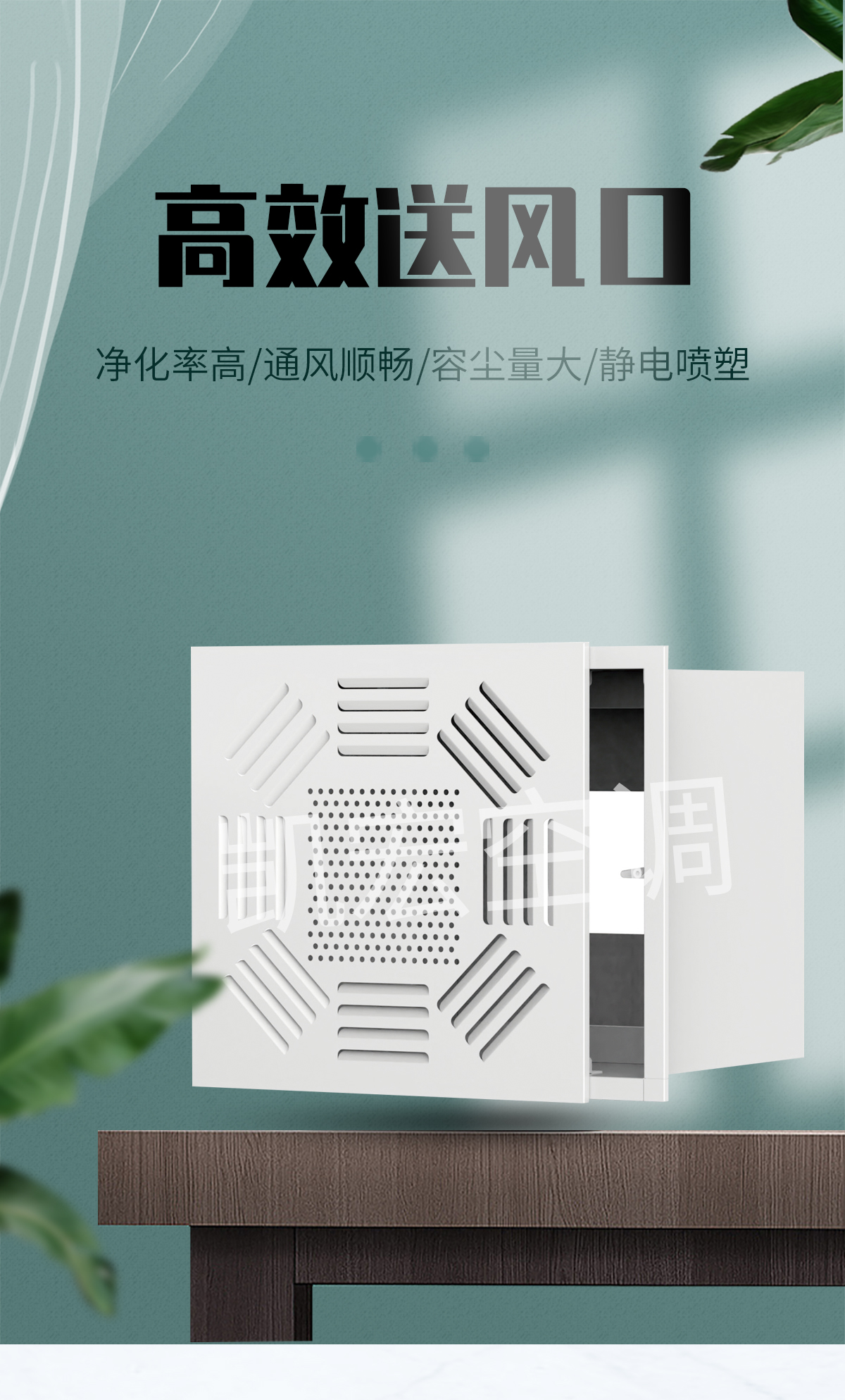高效送風口適合各種潔凈級別和多種維護結構的潔凈室,是千級、萬級、十萬級凈化空調系統較為理想的終端過濾裝置 高效送風口包含靜壓箱,散流板,高效過濾器,與風管的接口可為頂接或側接